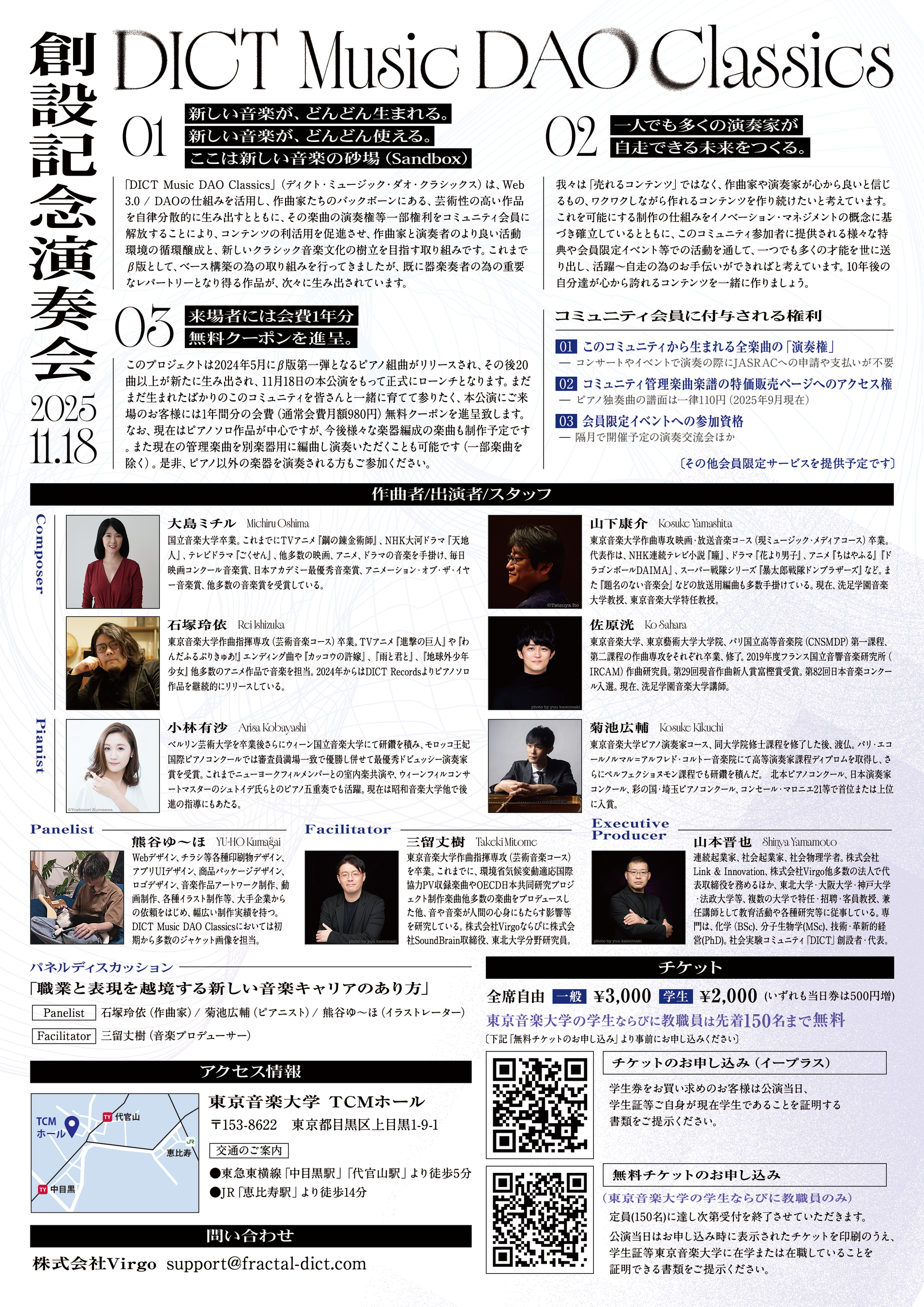 本楽曲『Prelude〜Water Lily』は、11月18日(火)18:30より東京音楽大学TCMホール(中目黒)で開催される「DICT Music DAO Classics 創設記念演奏会」にて世界初演されます。この演奏会では上記楽曲を含むその他新作の他、これまでに同プロジェクトから生み出された既存楽曲も世界初演(実演)されます。チケットはイープラスにて販売中ですので、是非生演奏でこれら楽曲をお楽しみください。チケットのお求めはこちら: https://eplus.jp/sf/detail/4388670001-P0030001