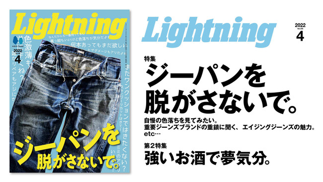 ジーパンを脱がさないで。2/28発売『Lightning(ライトニング)』2022年4月号は、穿き込みジーンズの魅力を大放出!第2特集はスピリッツ(ハードリカー)の楽しみ方をご紹介します。
