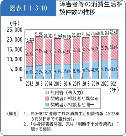 また、消費者庁が公表してる令和4年版消費者白書※によると、障がい者の消費生活相談件数は、2012年と2021年を比較すると約1.2倍増加しています。
