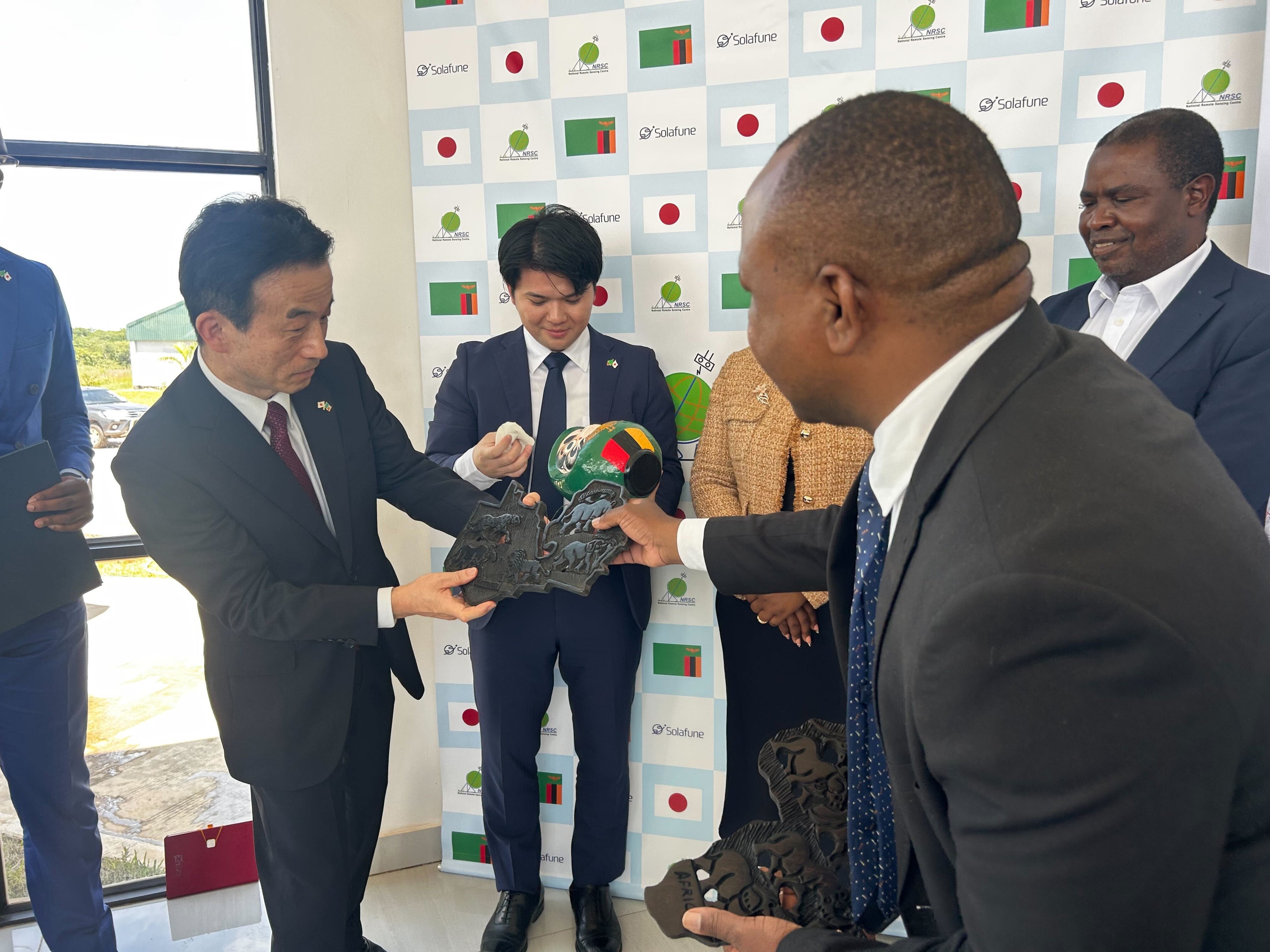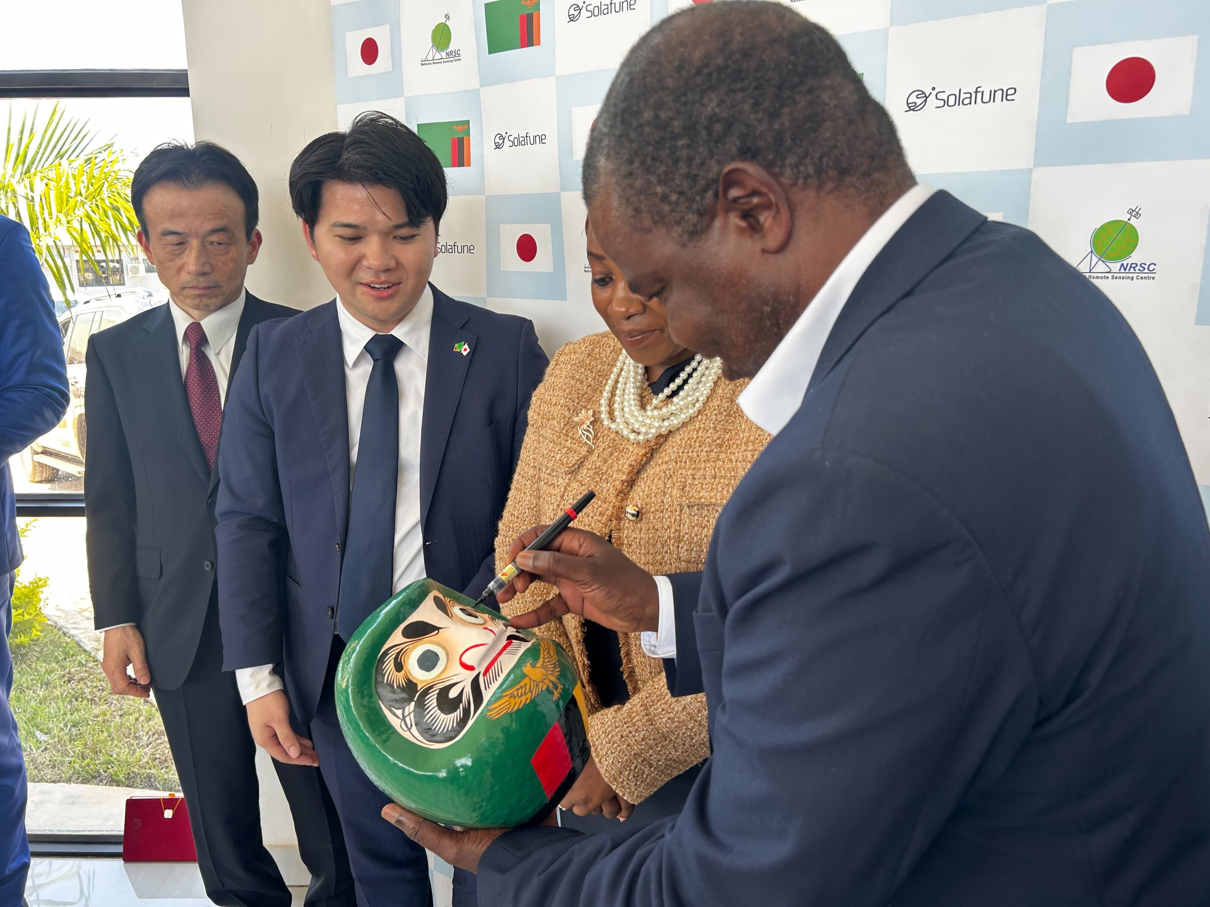 署名式には、ザンビア共和国National Remote Sensing Centre(NRSC)理事会議長のSamuel Chembe Maango氏、在ザンビア日本国大使館から三上明輝特命全権大使閣下および田中康泰一等書記官、株式会社Solafuneからは上地練CEOが出席しました。