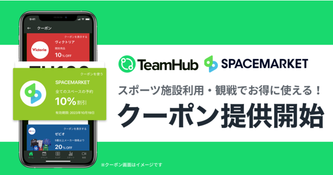 株式会社Link Sports(本社:東京都千代田区、代表取締役:小泉真也)は、運営するスポーツチーム応援アプリ『TeamHub』にて、新たに、株式会社スペースマーケット(本社:東京都渋谷区、代表取締役社長:重松大輔)が運営するあらゆるスペースを貸し借りできるプラットフォーム『スペースマーケット』で利用できる10%OFFクーポンを掲載開始したことをお知らせします。