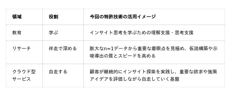 つまり本技術は、単なる分析効率化技術ではなく、顧客が「学ぶ」「深める」「自走する」ための循環を支える中核技術としての意味を持ちます。