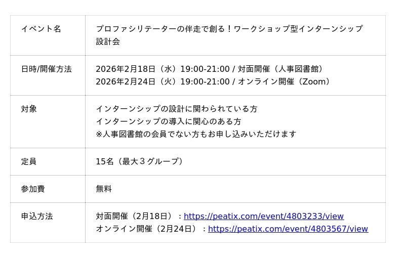 【イベント開催|人事図書館】「プロファシリテーターの伴走で創る!ワークショップ型インターンシップ設計会」を2月に開催(対面&オンライン)
