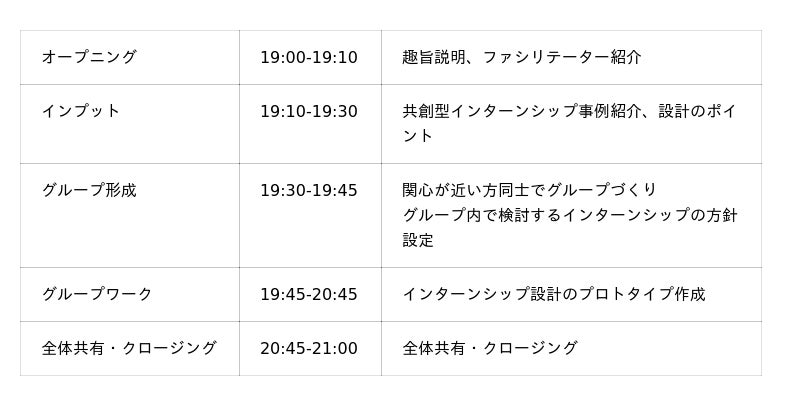 本イベントでは、フューチャーセッションズが企業と実践してきた「共創型インターンシップ」の知見をもとに、参加者が「ワークショップ型インターンシップ」のプロトタイプを120分で設計します。プロフェッショナルのファシリテーター3名が少人数グループを伴走し、少人数グループならではの学び合いを通じて、新しいインターンシップの形を考えます。