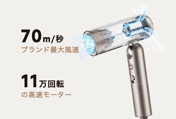 Dreame独自の高度技術で、「70m/秒」高速の気流を作り出すことを実現しました。パワフルな風で髪の毛全体を急速に乾かし、ヘアドライ時間を大幅にカットできます。一刻も早く乾かしたいという時も安心です。