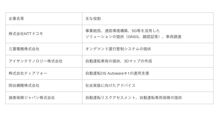 アイサンテクノロジー株式会社(本社:愛知県名古屋市、代表取締役社長:加藤 淳)、株式会社ティアフォー(本社:愛知県名古屋市、代表取締役社長:武田 一哉)、損害保険ジャパン株式会社(本社:東京都新宿区、代表取締役社長:西澤 敬二)、および、岡谷鋼機株式会社(本社:愛知県名古屋市、取締役社長:岡谷 健広)は、愛知県を実証主体とし、株式会社NTTドコモ(本社:東京都千代田区、代表取締役社長:井伊 基之)を幹事会社として、愛・地球博記念公園(長久手市)において「リニモ駅から園内目的地へのシームレスな移動」をテーマとした複数の自動運転車両による実証実験に参加をいたします。