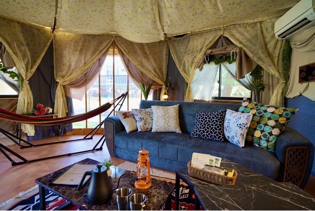 BBQサイト併設のグランピングゲル内にはエアコン、浴室、洗面台、お手洗いを完備!