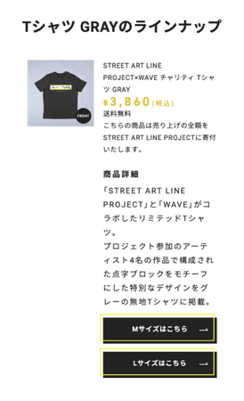 今回、プロジェクトへの協賛だけではなく、WAVEとSTREET ART LINE PROJECTがコラボレーションしたオリジナルチャリティーTシャツを作成、その売上金をプロジェクトに寄付することで、視覚障がい者の方々が安心して楽しく歩ける街づくりに寄与し、一時的な支援に留まらず、中長期的な支援として今後もプロジェクトとの活動に取り組んでまいります。