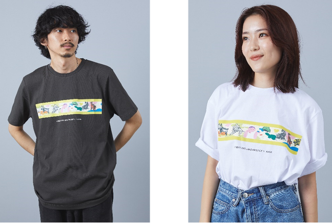Tシャツの胸元には、2023年3月〜5月に渋谷スクランブルスクエア2F館外通路に敷設された点字ブロックアートをプリント。プロジェクトに参加した4名のアーティストの作品で構成されたアートは、多様な生き物と環境の共存を表現しています。