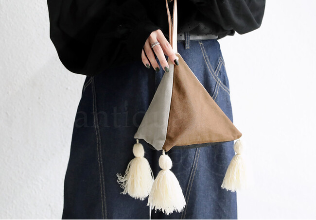 テトラ型のシルエットは程よいサイズ感でコーデのおしゃれなアクセントに。ガバッと大きく開くジップ式で、中の物が取り出しやすい機能性もポイントです。フリンジは手作り、持ち手は高級感のあるヌメ革で、細部までこだわり抜かれたバッグです。
