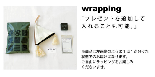 商品は1点ずつ分けた状態でのお届けになるため、プレゼントを追加して入れることも可能。自由にラッピングを愉しむことができます。