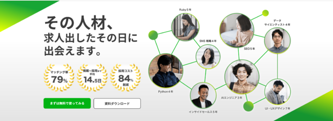 転職マーケットにいない即戦力人材を最短1日で見つけることができる、最速の複業マッチングプラットフォームです。20代後半〜40代前半のIT領域に強いエンジニア、マーケター、セールス、BizDev、UI・UXデザイナーの5職種を中心に、最近ではコーポレート人材なども増えております。また、スタートアップや上場企業との取引も増え、正社員で即戦力人材を採用したくても「採用するまで何か月も時間を要する」「スカウトメールの反応率が下がってきている」といったお悩みを持つ採用担当者様の課題解決のためのサービスを提供しております。