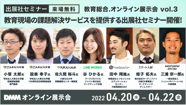 合同会社DMM.com(東京都港区、会長 兼 CEO 亀山敬司 以下、「DMM」)が展開するオンラインイベント事業は、2022年4月20日(水)から4月22日(金)に開催する教育総合.オンライン展示会Vol.3にて、教育現場の課題解決サービスを提供している出展企業担当者が登壇するセミナー配信を決定いたしました。