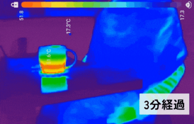 約17.0℃〜17.3℃の室内で30分間のブランケットの保温機能試験を実施装着後、約5分後から温かくなりはじめ、20分後には人間の快適ゾーンといわれる温度約24℃〜25℃を維持。