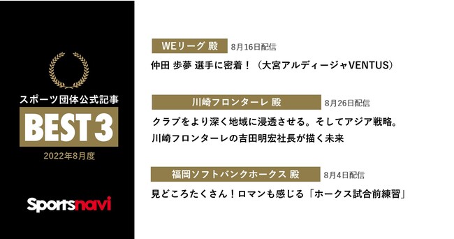 WEリーグ、川崎フロンターレ、福岡ソフトバンクホークスが受賞! スポーツ団体公式記事月間ベスト3(2022年8月度)