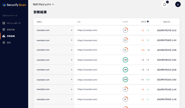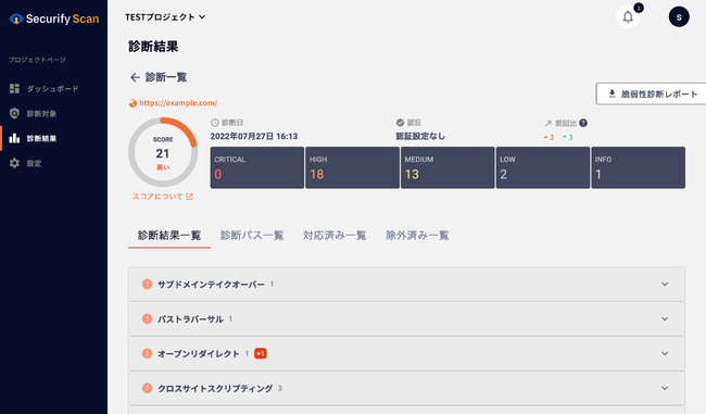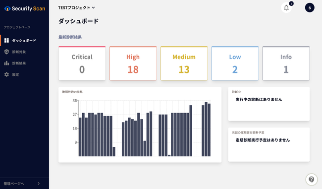 ・最新の診断結果や、診断の状況、発見された脆弱性の推移など、現在のステータスを直感的に把握できます。