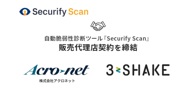 SREおよびセキュリティのプロフェッショナル集団である、株式会社スリーシェイク(本社:東京都新宿区、代表取締役社長:吉田 拓真、以下スリーシェイク)は、株式会社アクロネット(本社:東京都中央区、代表取締役:秋田谷 剛、以下アクロネット) と、手軽に社内でセキュリティ診断を実施できる自動脆弱性診断ツール『Securify Scan(セキュリファイ スキャン)』において、販売代理店契約を締結したことをお知らせします。
