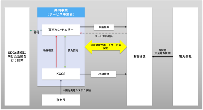 東京センチュリー株式会社(以下「東京センチュリー」)と京セラ株式会社(以下「京セラ」)、京セラコミュニケーションシステム株式会社(以下「KCCS」)は、SDGs(持続可能な開発目標)の達成に資する新たな取り組みとして、寄付型のコーポレートPPA(自家発電サポートサービス)の提供を開始いたしました。3社は、今後も本サービスの推進などを通じて、脱炭素社会の実現ならびにSDGs達成に向けた活動を行う団体への寄付などにより、持続可能な社会の実現に貢献してまいります。