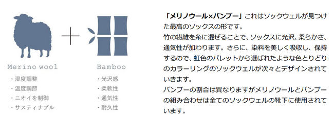 一年を通して快適に使用できる高い機能性を持つメリノウールをベースに、サスティナブルなバンブー(竹)やアルパカをブレンドしたオリジナル繊維を紡ぎ、より良い履き心地のソックスに仕上げました。
