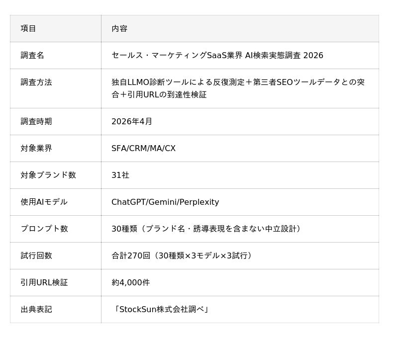 StockSun株式会社(本社:東京都新宿区)認定パートナーの石田健太は、セールス・マーケティングSaaS業界の主要31社を対象に、ChatGPT・Gemini・Perplexityの3モデルに対して、ユーザー想定の質問30種類を各3回ずつ投げる反復測定(合計270回)を実施しました。AI回答に含まれた引用URLは約4,000件を収集し、Google検索の指名検索ボリュームや被リンク関連の指標(第三者SEOツールから取得)と突合しています。