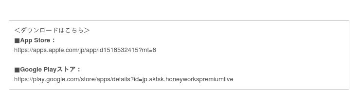 ・GooglePlayストア:https://play.google.com/store/apps/details?id=jp.aktsk.honeyworkspremiumlive