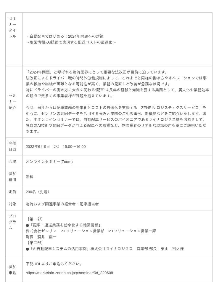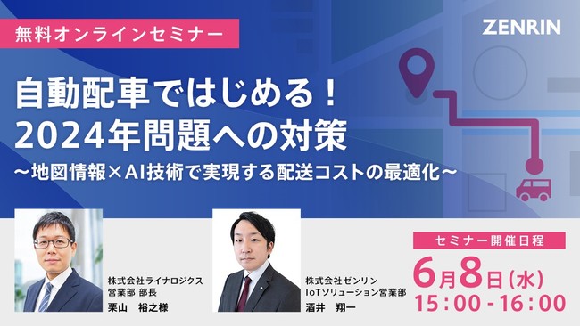 株式会社ゼンリン(本社:福岡県北九州市、代表取締役社長:高山善司、以下ゼンリン)は2022年6月8日(水)15時より、「自動配車ではじめる!2024年問題への対策セミナー」と題してオンラインセミナーを開催します。