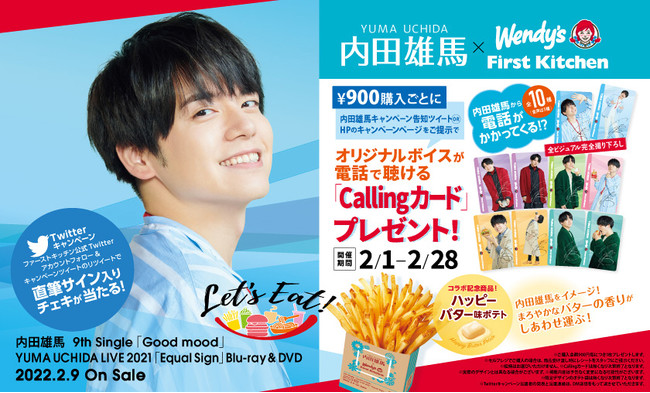 ファーストキッチン株式会社(代表取締役:紫関修 所在地:東京都新宿区)では2月1日(火)より、ウェンディーズ・ファーストキッチン店舗ならびにファーストキッチン店舗にて、若手声優で音楽活動など幅広い活動を行っている内田雄馬さんとのコラボキャンペーンを開催いたします。 900円毎のご購入の際、キャンペーン告知ツイート or 当社HPのキャンペーンページを提示すると、内田雄馬さんオリジナル 『Cαllingカード(ボイス付きカード)』がもらえるプレゼントキャンペーンを開催。またコラボ開催を記 念して、内田雄馬さんをイメージしたフレーバーポテト、「ハッピーバター味ポテト」を期間限定販売します。 さらに期間中「渋谷センター街店」「池袋北口店」「梅田芝田町店」にて内田雄馬さんの特別装飾を実施!!ここでしか見られない内田雄馬さんの完全撮りおろしフォトパネルが皆様をお迎えいたします。ご来店をお待ちいたしております。