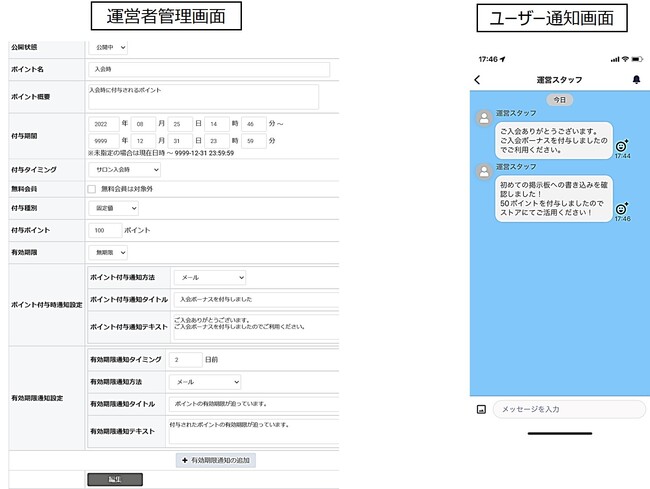 コミュニティ毎に運営状況に応じたポイント総量が設定できます。条件に応じてユーザーにコミュニティのストア上で利用可能なポイントを付与することが可能。ポイント付与時はメールまたはメッセージでユーザーに通知をしたり、使用有効期限を指定することもできます。