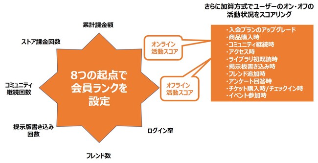 ユーザーの活動状況に応じて8つの要素を元に会員ランクを設定することができます。