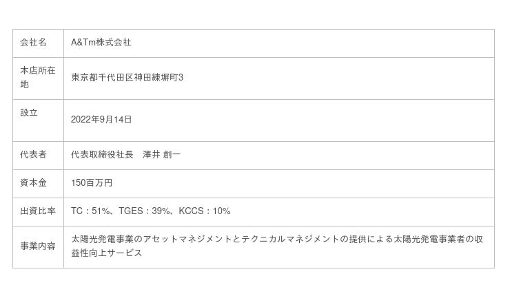 東京センチュリー株式会社(以下「TC」)、東京ガスエンジニアリングソリューションズ株式会社(以下「TGES」)、京セラコミュニケーションシステム株式会社(以下「KCCS」)の3社は、太陽光発電事業におけるアセットマネジメントサービスとテクニカルマネジメントを提供する共同事業会社「A&Tm株式会社」(以下「A&Tm」)を設立いたしました。3社は、A&Tmを通じた、再生可能エネルギー事業における様々な課題を解決することで、さらなる普及拡大に貢献します。今後は、再生可能エネルギー由来の電力を長期的にかつ最大限有効活用するために、蓄電池活用の提案等の新たなビジネスの創出も目指してまいります。