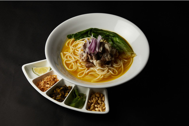 鷹の爪の10倍の辛さを誇る中国海南島産の黄色唐辛子を使用した激辛酸湯スープに、薄切り牛肉をトッピングした麺料理。辛さの奥にある酸味と旨味はクセになる美味しさです。別添えのミントや干しエビで自分好みの一皿に仕上げてください。