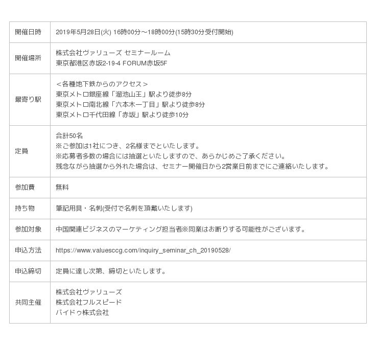 ネット行動分析サービスを提供する株式会社ヴァリューズ(本社:東京都港区、代表取締役社長:辻本 秀幸)は、インターネットマーケティング支援をおこなう株式会社フルスピード(所在地:東京都渋谷区、代表取締役社長:友松 功一)と、中国最大の検索エンジン「百度」の日本法人であるバイドゥ株式会社(本社:東京都港区、代表取締役社長:Charles Zhang)と共催で、中国の最新デジタル事情やインバウンド動向からマーケティング設計手法まで解説する中国インバウンドセミナーを、2019年5月28日(火)に東京・赤坂で無料開催いたします。