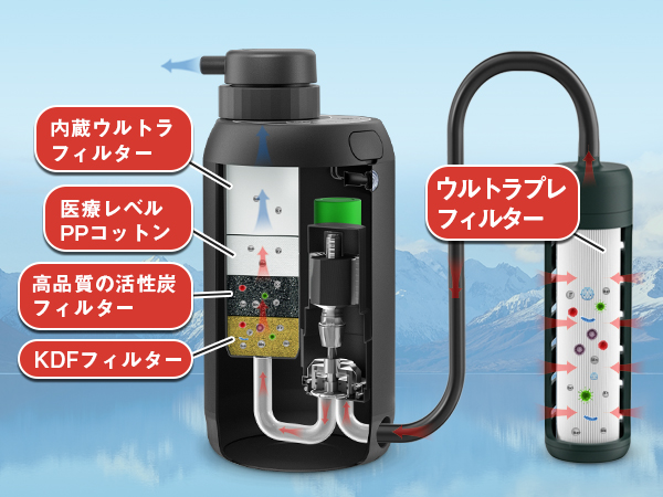 3.フィルターは、取り外し可能な設計となっており、古いフィルターを簡単に交換することができます。Greeshowの浄水器は、大容量バッテリーを搭載し、連続で1000L以上の水を濾過できます。独自の「5段階浄水システム」の仕組みをご紹介致します。