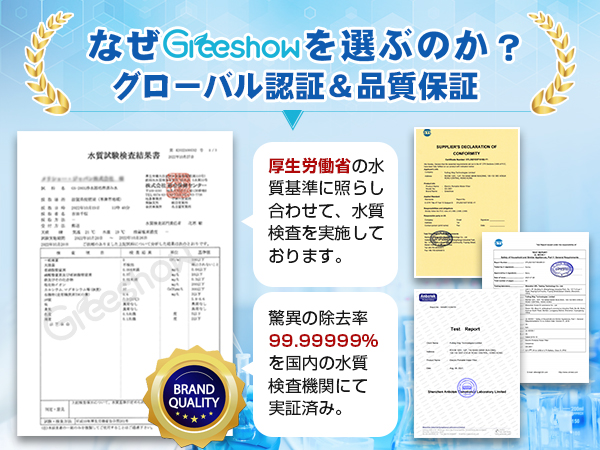 厚生労働省の水質基準に、水質検査を実施しております。プロも信頼するほどの安全品質のことを水質検査成績書にて実証しております。アメリカのNSF水処理、NSF認証素材で、ヨーロッパのLFGBの厳しい食用水の安全基準をクリアした水質であることを実証済みです。細菌、ウィルス、原虫嚢子(のうし)など除去率99.99999%、バクテリア、ウィルス、重金属、プラスチック粒子を取り除き、効果的に水の味を改善します。