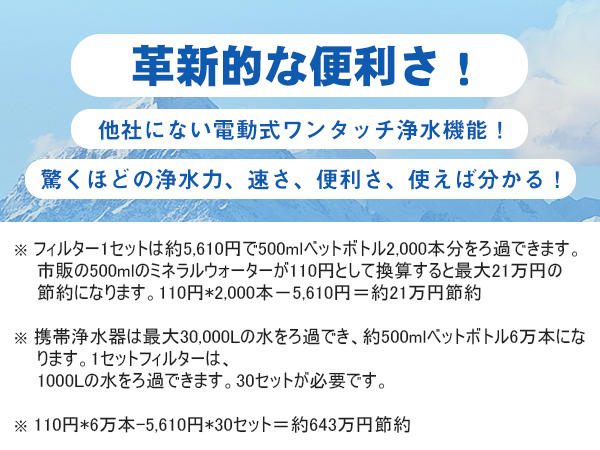 この携帯浄水器は、災害や断水などの緊急時、地震、津波、台風、豪雨などの自然災害が発生した時、川やため池の水、お風呂の残り水などを安心して飲めるほど透き通った清潔な飲料水にろ過することができます。大切な家族の為の災害時の備え! 緊急用に一つ常備しておくことをおすすめします。