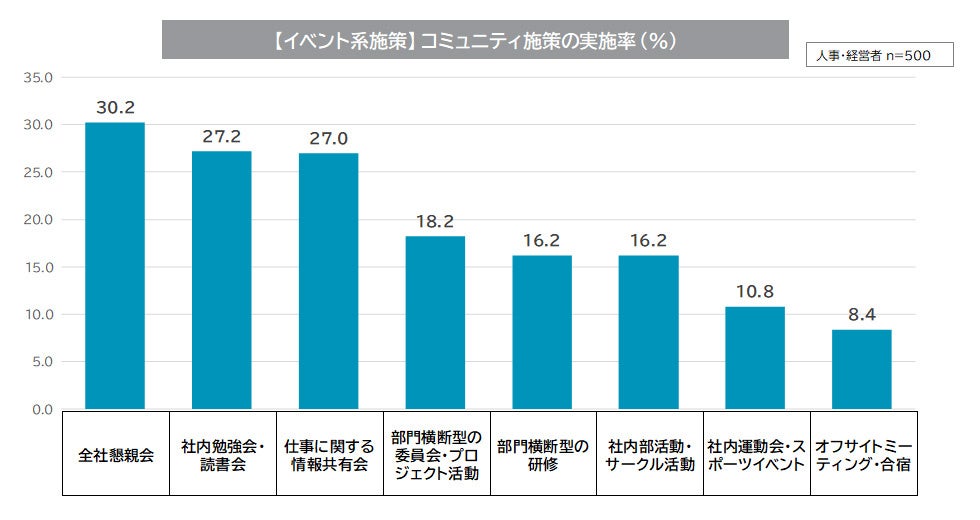 企業のネットワーク/コミュニティ施策実施率(イベント系):イベント系のコミュニティ施策の中では、「全社懇親会」が最も多く30.2%。次いで、「社内勉強会・読書会(27.2%)」、「仕事に関する情報共有会(27.0%)」が続く。
