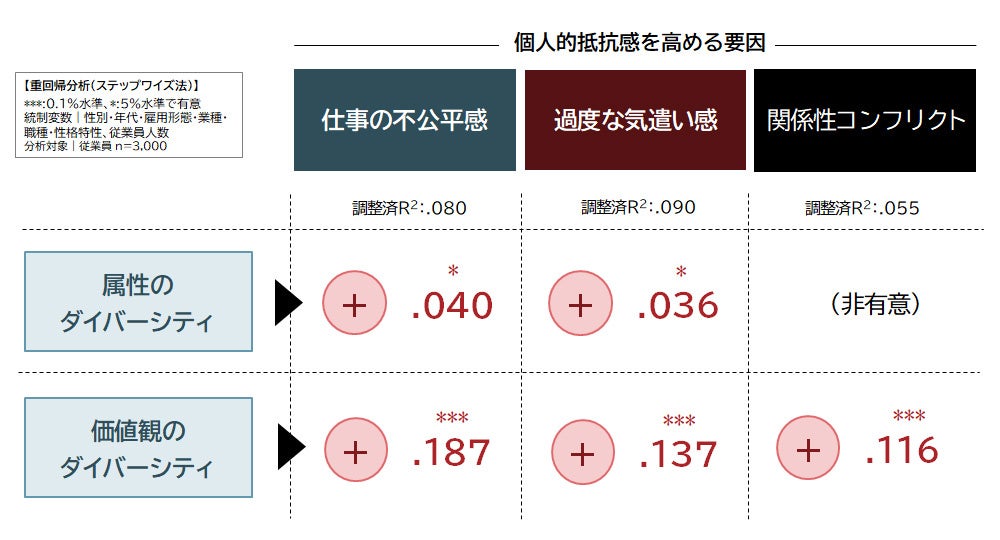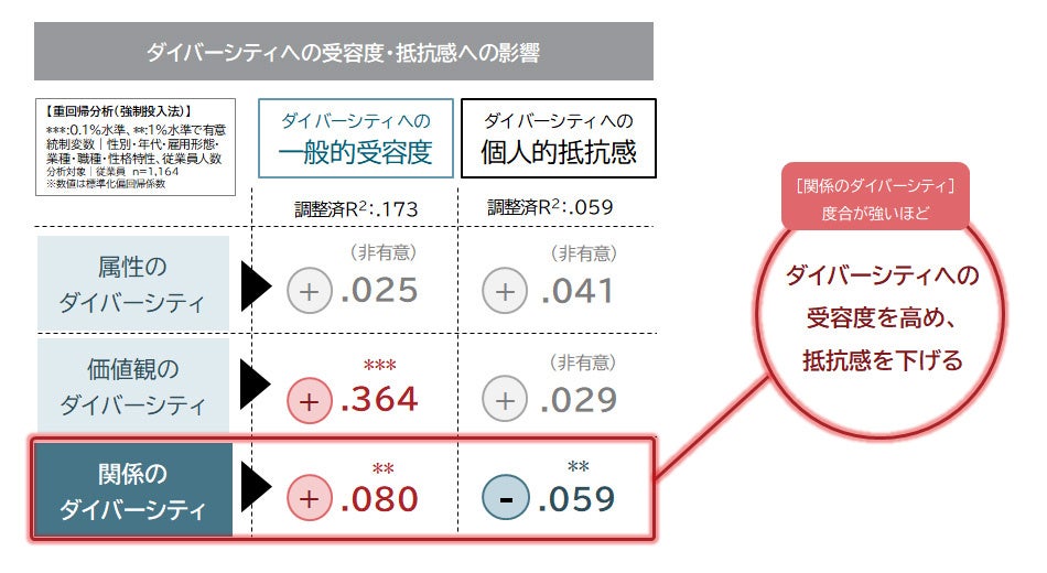 「関係のダイバーシティ」が与える影響:ダイバーシティへの一般的受容度、個人的抵抗感に対して与える影響を分析すると、「属性のダイバーシティ」と「価値観のダイバーシティ」は、どちらの要素も高める傾向が見られる一方、「関係のダイバーシティ」は一般的受容度を高めつつ、個人的抵抗感を下げる傾向が確認された。