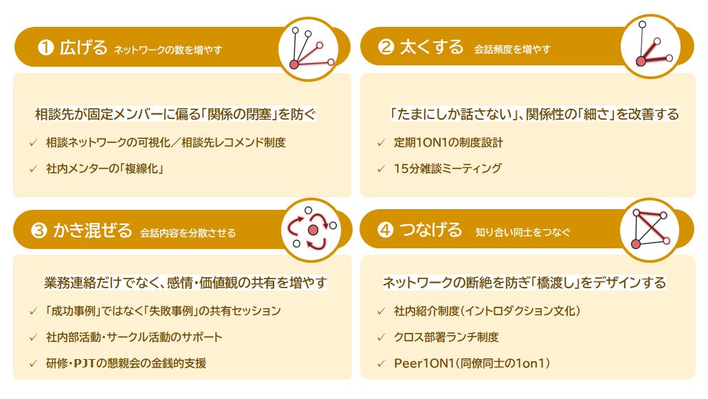 関係のダイバーシティに対してプラスの関係がみられたコミュニティ施策:各コミュニティ施策が「関係のダイバーシティ」に与える影響を多変量解析で分析した。1.広げる:ネットワークの数を増やす施策、2.太くする:会話頻度を増やす施策、3.かき混ぜる:会話内容を分散させる施策、4.つなげる:知り合い同士をつなぐ施策の4施策が「関係のダイバーシティ」を強化する傾向。