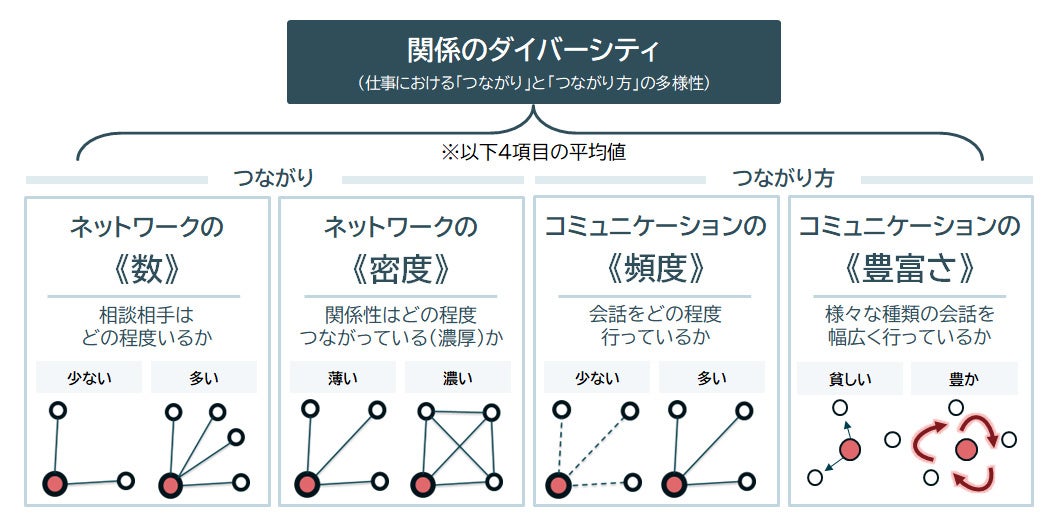 本調査では、仕事における「つながり」と「つながり方」の多様性を測定する以下4項目の平均値を基に、「関係のダイバーシティ」を定義し分析に用いた。※各項目の聴取方法や平均値については報告書P37~40を参照