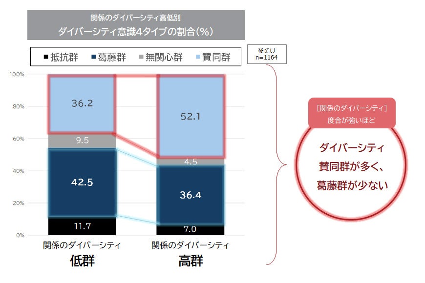 また、「関係のダイバーシティ」スコアの高群は、低群よりも「ダイバーシティ賛同群」が多く、「ダイバーシティ葛藤群」が少ない傾向が確認された。
