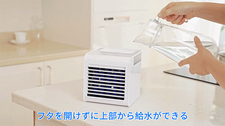 上部から本体タンクに給水し、内部のフィルターが吸水して涼しい風をお届けします。