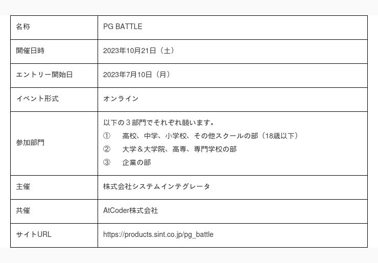 株式会社システムインテグレータ(本社:さいたま市中央区、代表取締役社長 CEO:引屋敷 智、東京証券取引所スタンダード市場:証券コード3826、以下「当社」)は、企業・学校対抗プログラミングコンテスト「PG BATTLE 2023」(2023年10月21日開催)を2023年7月10日よりエントリー開始することをお知らせします。