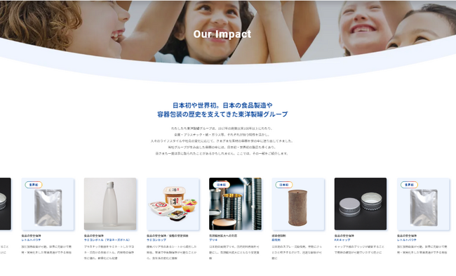 日本の食品製造や容器包装の歴史を支えてきた当社グループの製品の紹介や、暮らしの中の身近なシーンを支えている製品、新たな社会価値創造への取り組みを紹介しています。