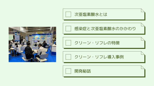 展示会期間中、開発者内海洋氏によるプチ講演会をブース内で行いました。次亜塩素酸水について、クリーン・リフレの特徴など、開発者だから話せるこだわりや秘話をお伝えしています。
