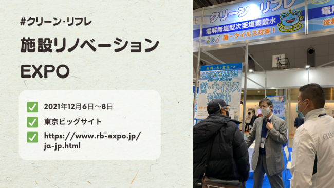 株式会社武蔵野(代表取締役社長:小山昇)は、2021年12月6日(月)から8日(水)に開催された『施設リノベーションEXPO』にアクト武蔵野として出展しました。コロナウイルス感染は落ち着きを見せているものの、国内でもオミクロン株の感染者が報告され、今後も感染症対策がは必須であると予想されます。ブースでは6日に開発者内海洋 氏の講演会実施、次亜塩素酸水「クリーン・リフレ」を使った実験など、多くのご来場者の方々に実際に商品をお試しいただきました。来場者の皆様からは「次亜塩素酸水は知ってますが、塩と水から出来るのは知らなかった」「次亜塩素酸は危ないものと勘違いしていた」といった声をいただきました。今後も除菌に悩むすべての方、感染症と日々向き合う方々の一助となる活動を続けていきます。