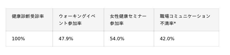 [表: https://prtimes.jp/data/corp/115844/table/75_1_2f4b6b889f057034cafb8d564922f89c.jpg?v=202603310415 ]*職場コミュニケーション不満率は、前年度60%から42%へ改善(令和7年度健康経営度調査フィードバックシートより)。
