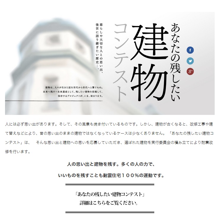 「耐震住宅100%」の活動の一貫。老朽化が進んで取り壊しが予定されていたり、耐震強度が不足していて危険と思われる古い建物などで、思い出に残る場所や後世に残すに相応しいと思う建物を一般の方から募集。そのなかから、耐震改修できる物件を選び、皆様のfacebookからの「いいね!」の投票数を含む、厳選なる審査のうえ大賞を決定。大賞に選ばれた物件に対して、耐震住宅100%実行委員会で、耐震改修を行う。