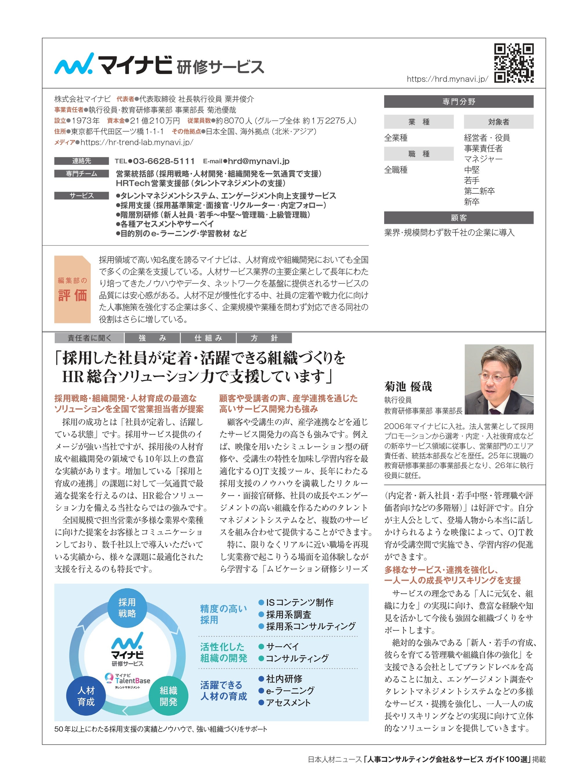 人事専門誌「日本人材ニュース」を発行する株式会社日本人材ニュース社(東京都千代田区、代表取締役:吉越利成)は、企業の人材育成・組織開発を支援する優れた会社とサービスを紹介する「人事コンサルティング会社&サービスガイド100選」に、マイナビ研修サービス(東京都千代田区、菊池優哉執行役員)が参画したことをお知らせいたします。