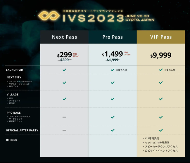 「IVS2023 KYOTO」「IVS Crypto 2023 KYOTO」ともに、スタートアップ経営者やCXO、投資家、事業会社のマネージメント層のみが入れる”PRO BASE”ゾーンに入場いただけるチケットです。このゾーンの目的は事業成長です。より真剣なコミュニケーションを産み出すためのセッションやワークショップ、ネットワーキングラウンジなどをご用意しております。またNEXT CITYなどにも入場いただけます。なお購入後に資格審査がございますのでご了承ください。