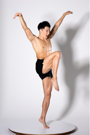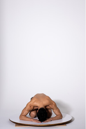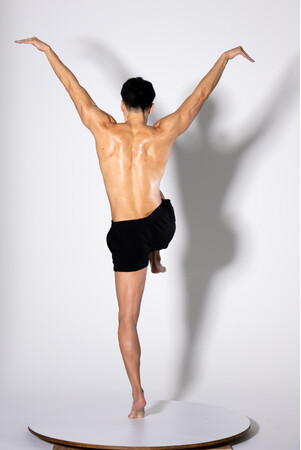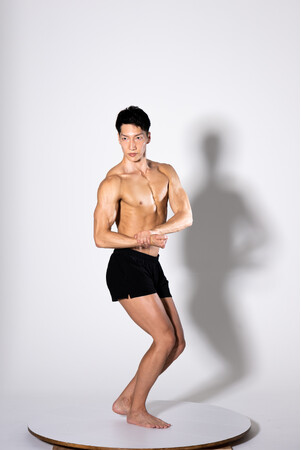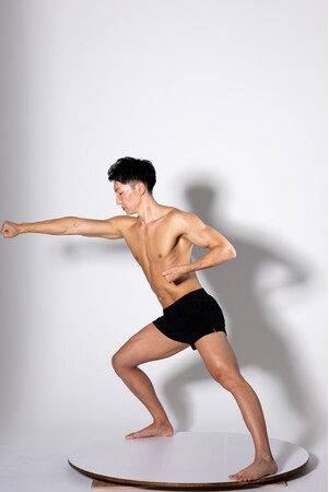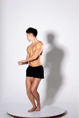 マッチョモデルが回転台に乗った状態でポーズを取り、回転させながら各角度から撮影。